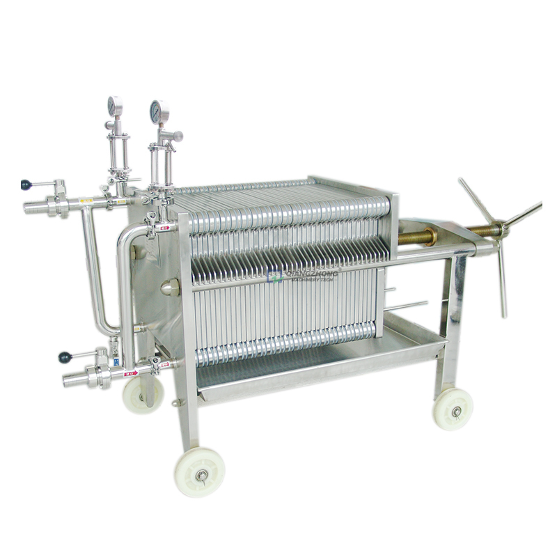 不锈钢板框式精滤机的每块滤板的四角有4个通液角孔,只有一侧竖向的2个角孔与内部相通,滤板与滤框交替排列(两面带孔板的为滤板,无孔板的为滤框)。过滤时,由滤框一侧的2个通液角孔进料,透过过滤层(过滤介质)后,清液由滤板一侧的2个出液角孔排出。